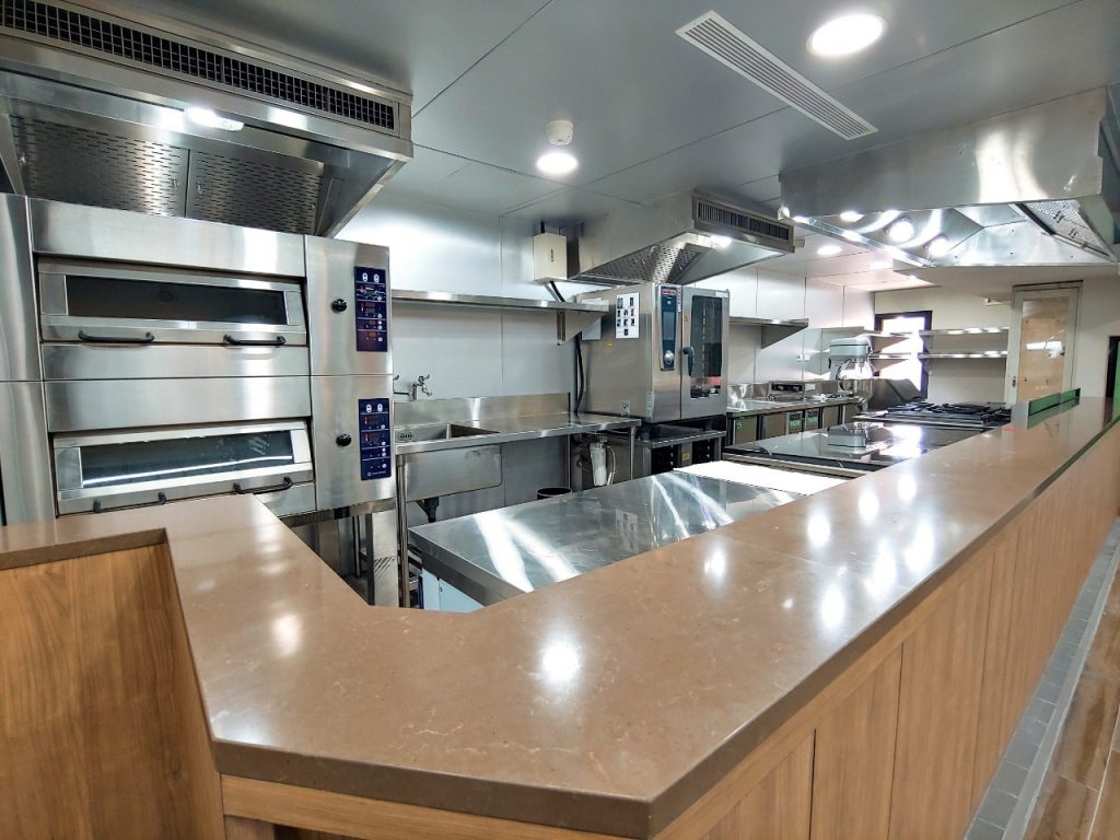 主要設備:配備中西餐爐具、真空包裝機、攪拌機、萬能蒸烤箱、急速冷凍等專業設備,並具備煙罩、消防監控等安全設施。